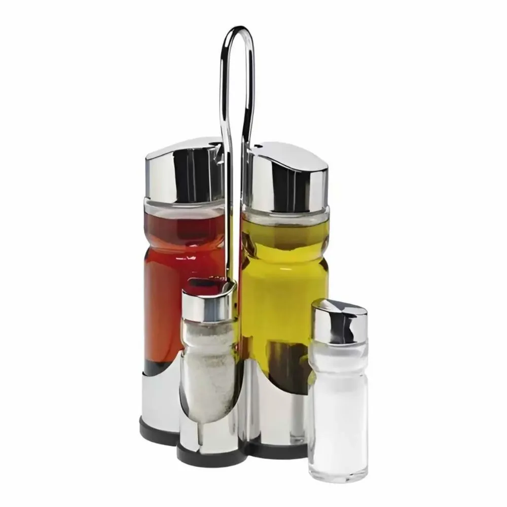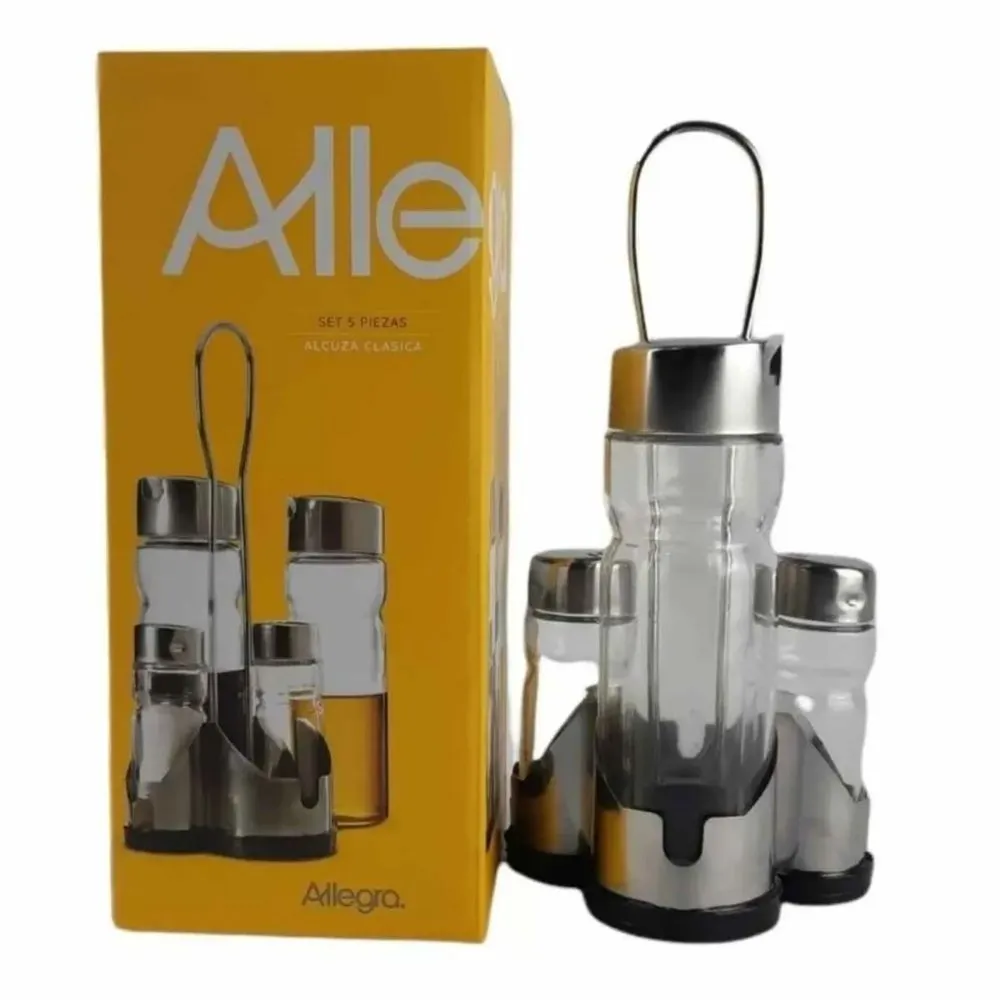 El Set Alcuza Clásica ALLEGRA de 5 piezas es ideal para organizar y servir aceites, vinagres, sal y otros condimentos con estilo y funcionalidad. Incluye 2 botellas de vidrio de 180 cc para líquidos, 2 botellas de 40 cc para sólidos y un pedestal metálico resistente, perfecto para mantener todo ordenado en la cocina o sobre la mesa.