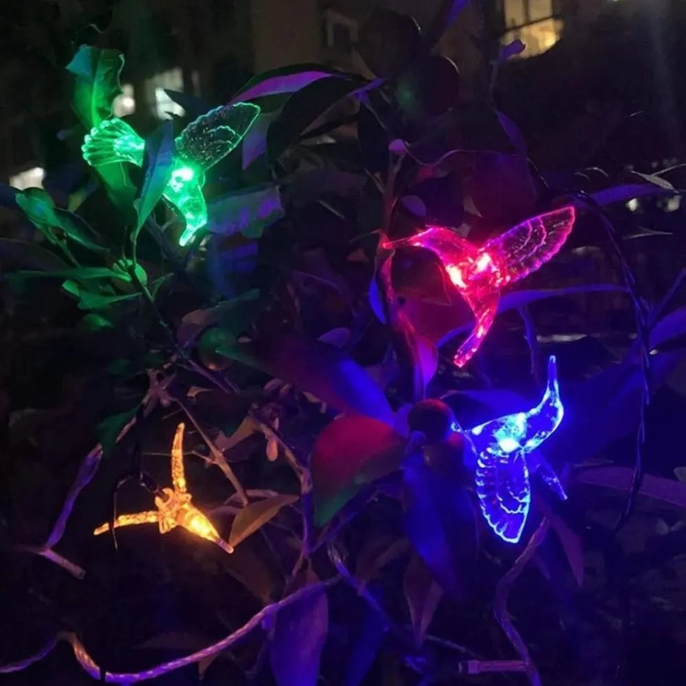 Ilumina tus espacios exteriores con encanto natural gracias a esta cadena de luces LED con colibríes. Funciona con energía solar, por lo que no requiere cables ni consumo eléctrico. Cada colibrí emite una luz suave y colorida que se enciende automáticamente al anochecer, creando un ambiente mágico en jardines, balcones, patios o eventos especiales.