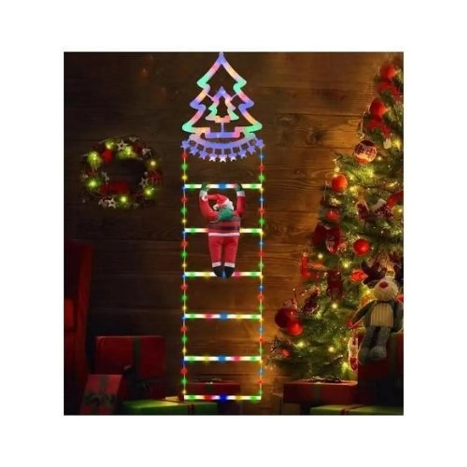 Dale vida a tu hogar esta Navidad con la encantadora escalera LED con Viejito Pascuero solar. Con 6 peldaños iluminados, esta divertida decoración muestra al querido Santa subiendo la escalera mientras ilumina tus noches festivas con luces LED cálidas y brillantes.