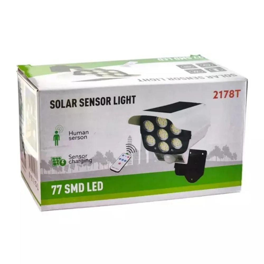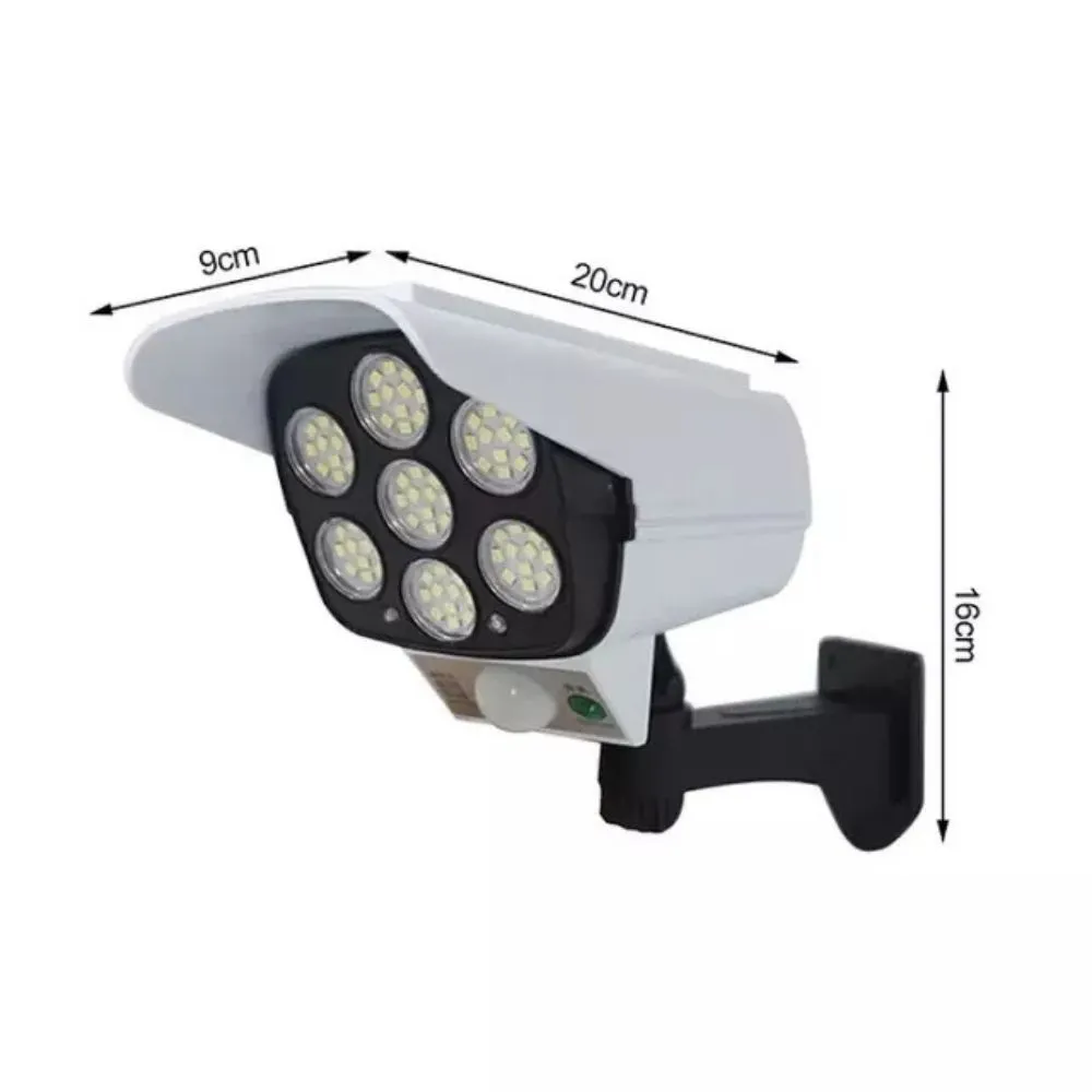 Ilumina y protege tu hogar con foco solar LED tipo cámara. Sensor de movimiento 120°, control remoto, resistente al agua y fácil instalación.