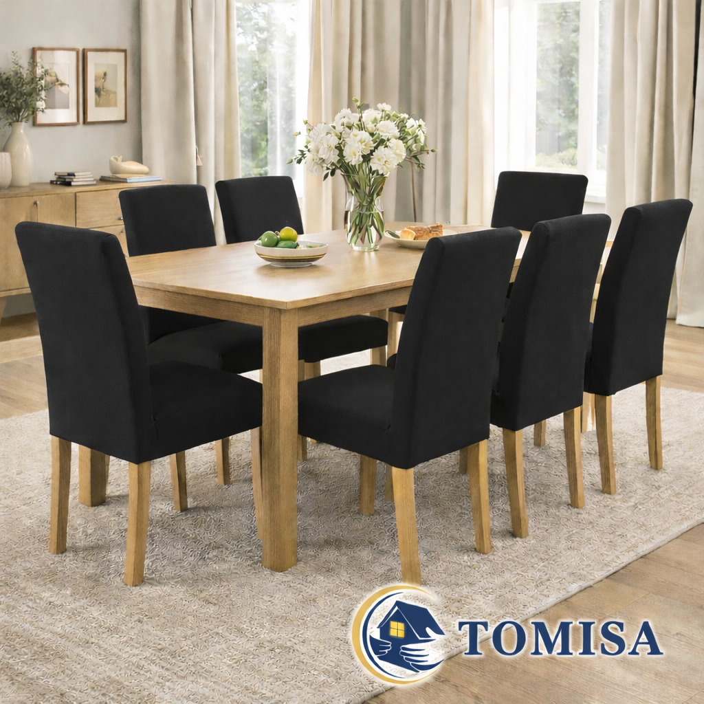Renueva y protege tus sillas con la funda elástica para silla Tomisa, diseñada para ofrecer un ajuste perfecto y un acabado elegante. Este set incluye 6 forros de silla, ideales para uso en comedor, cocina u ocasiones especiales.