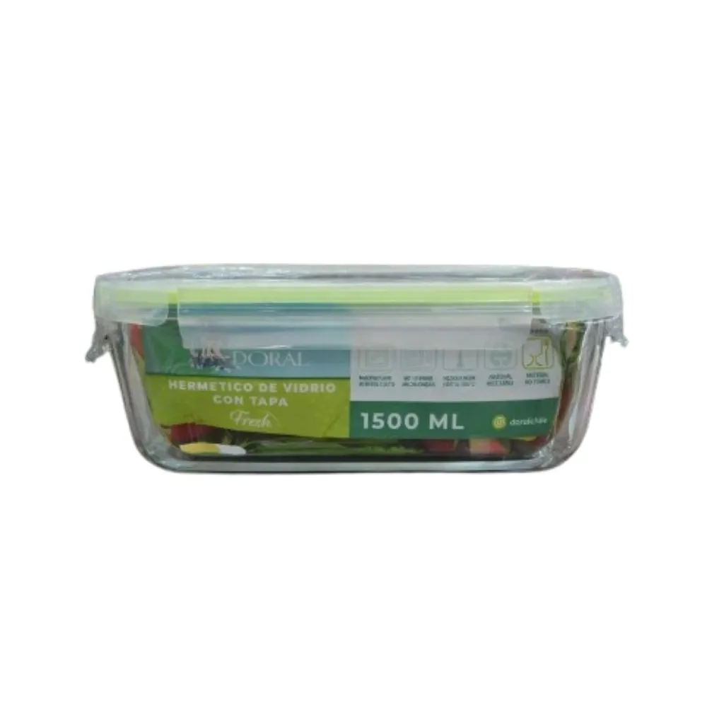 El hermético de vidrio rectangular DORAL Fresh de 1500 ml es ideal para conservar alimentos frescos por más tiempo. Fabricado en vidrio resistente de alta calidad, cuenta con tapa hermética con cierre seguro que evita derrames y mantiene el sabor y la textura de tus comidas. Perfecto para guardar alimentos en la nevera, despensa o llevar al trabajo, es una opción práctica, duradera y fácil de limpiar. Apto para uso diario, libre de olores y manchas, ideal para organizar tu cocina con estilo y seguridad.