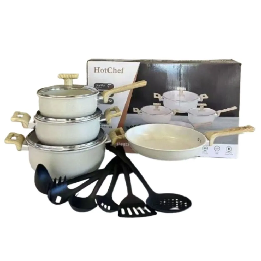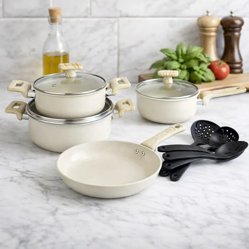 Práctico y resistente juego de ollas fabricado en hierro, ideal para el uso diario en la cocina. Su diseño ofrece una excelente distribución del calor, permitiendo una cocción uniforme y eficiente de tus alimentos. El set incluye una olla de leche de 18 cm, ollas de sopa de 20 y 24 cm, un sartén de 24 cm y 6 piezas de espátulas de nylon, perfectas para proteger el recubrimiento y facilitar la preparación de todo tipo de recetas. Una opción funcional y duradera para equipar tu cocina con lo esencial.
