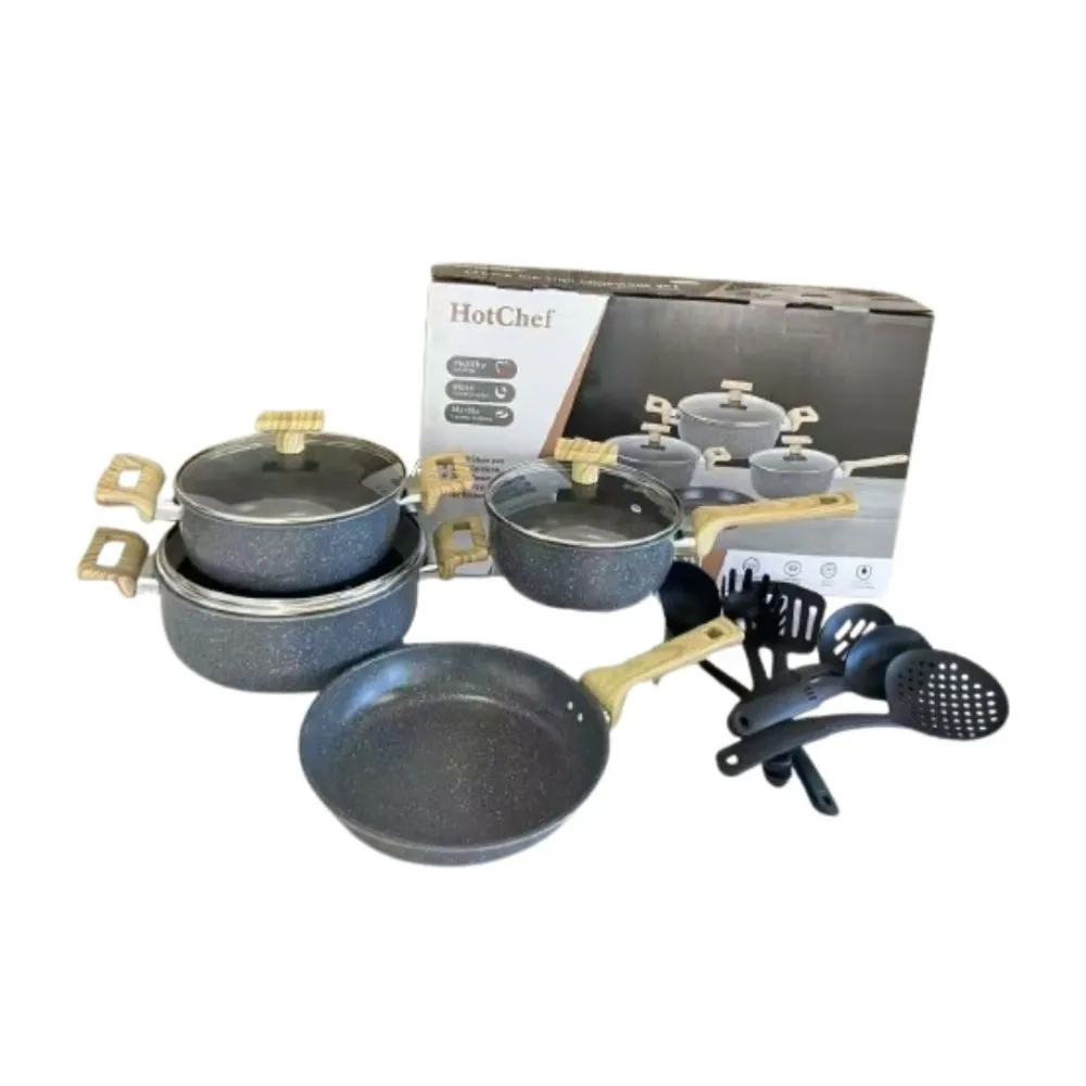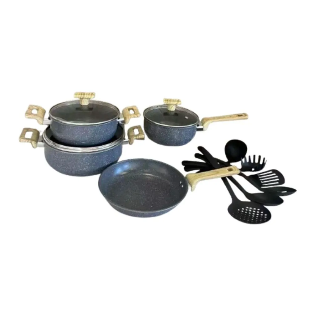 Práctico y resistente juego de ollas fabricado en hierro, ideal para el uso diario en la cocina. Su diseño ofrece una excelente distribución del calor, permitiendo una cocción uniforme y eficiente de tus alimentos. El set incluye una olla de leche de 18 cm, ollas de sopa de 20 y 24 cm, un sartén de 24 cm y 6 piezas de espátulas de nylon, perfectas para proteger el recubrimiento y facilitar la preparación de todo tipo de recetas. Una opción funcional y duradera para equipar tu cocina con lo esencial.