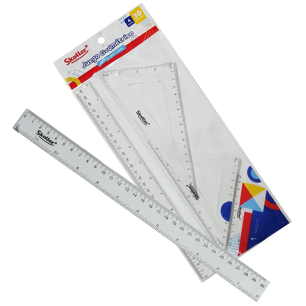 Este set contiene una regla graduada de 30 cm, una escuadra, un cartabón y un transportador, perfectos para medir ángulos, trazar líneas y realizar cálculos geométricos con exactitud. Fabricado con materiales durables, el juego geométrico Skoller garantiza un desempeño confiable en el aula o en casa.