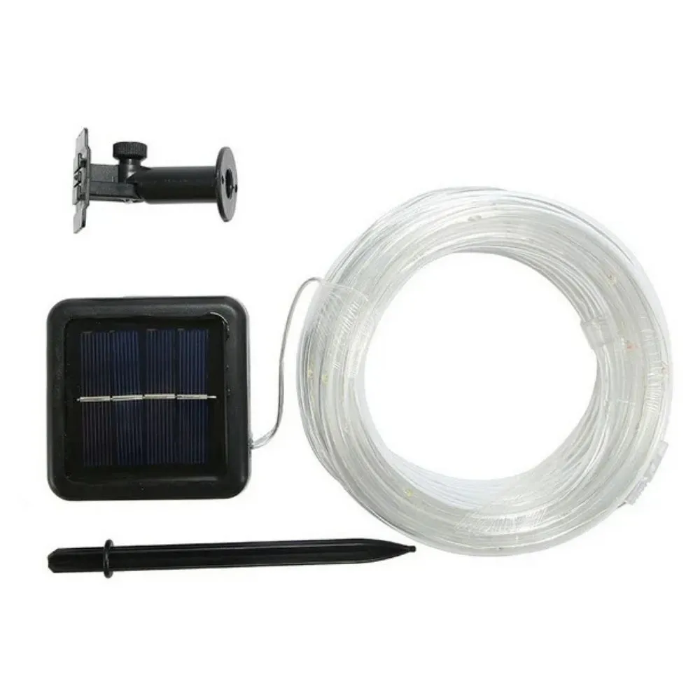 Ilumina tus espacios exteriores con esta cadena de 100 lámparas solares montadas en un tubo de cobre flexible de 10 metros y 5 mm de grosor. Diseñada para ofrecer brillo, durabilidad y eficiencia, esta luminaria utiliza energía solar para funcionar sin cables ni consumo eléctrico.