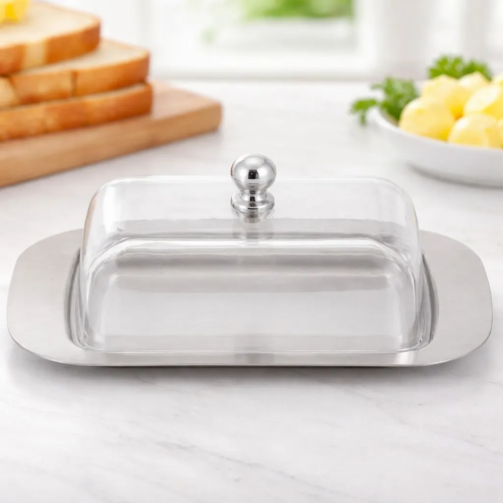 Mantequillero de acero inoxidable con tapa de vidrio, ideal para conservar la mantequilla fresca y protegida por más tiempo. Su diseño elegante y funcional se adapta perfectamente a cualquier cocina moderna o tradicional. La tapa de vidrio transparente permite ver el contenido sin necesidad de abrirlo, manteniendo la higiene y el aroma original.