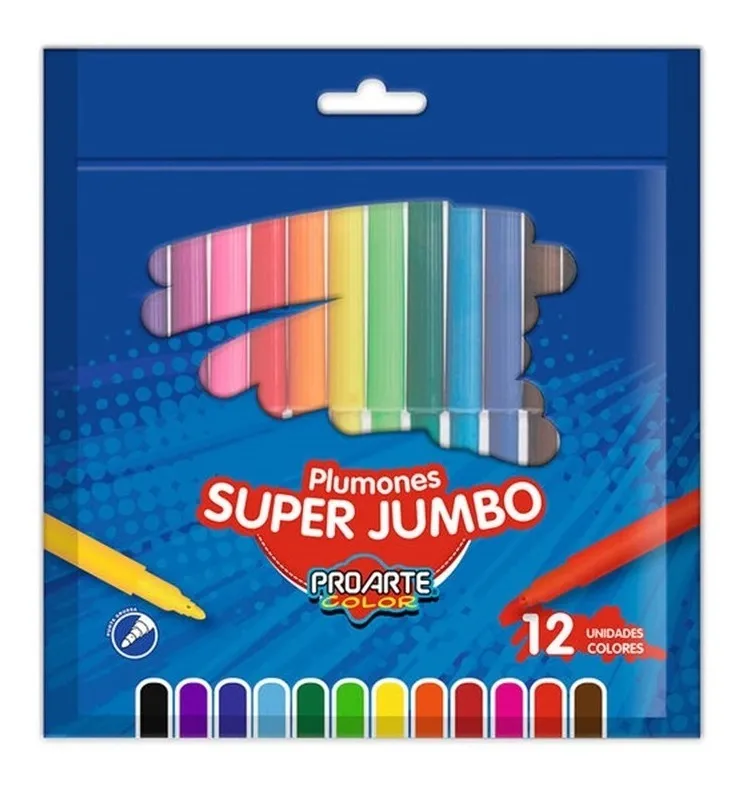 Los Plumones Proarte Super Jumbo de 12 colores son ideales para niños, escolares y actividades creativas. Cuentan con punta gruesa resistente, perfecta para trazos amplios y coloreado uniforme. Sus colores intensos y brillantes estimulan la creatividad, mientras que su tinta lavable y no tóxica brinda mayor seguridad. Plumones durables, cómodos de usar y perfectos para el colegio, el hogar o talleres artísticos.