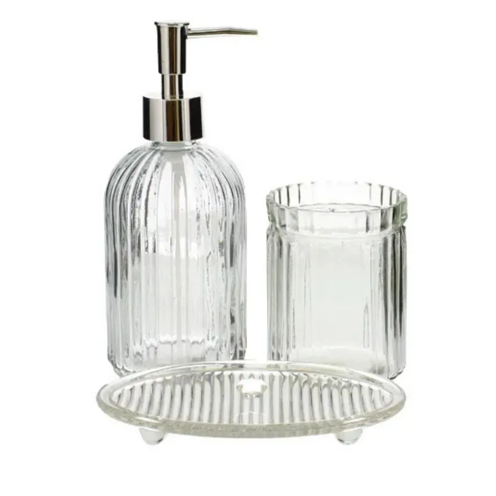 El set incluye un dispensador de jabón de 450 ml, un vaso multifuncional de 350 ml y un plato organizador de 9,5 x 15 cm, ideales para mantener tus artículos de higiene siempre ordenados y al alcance.