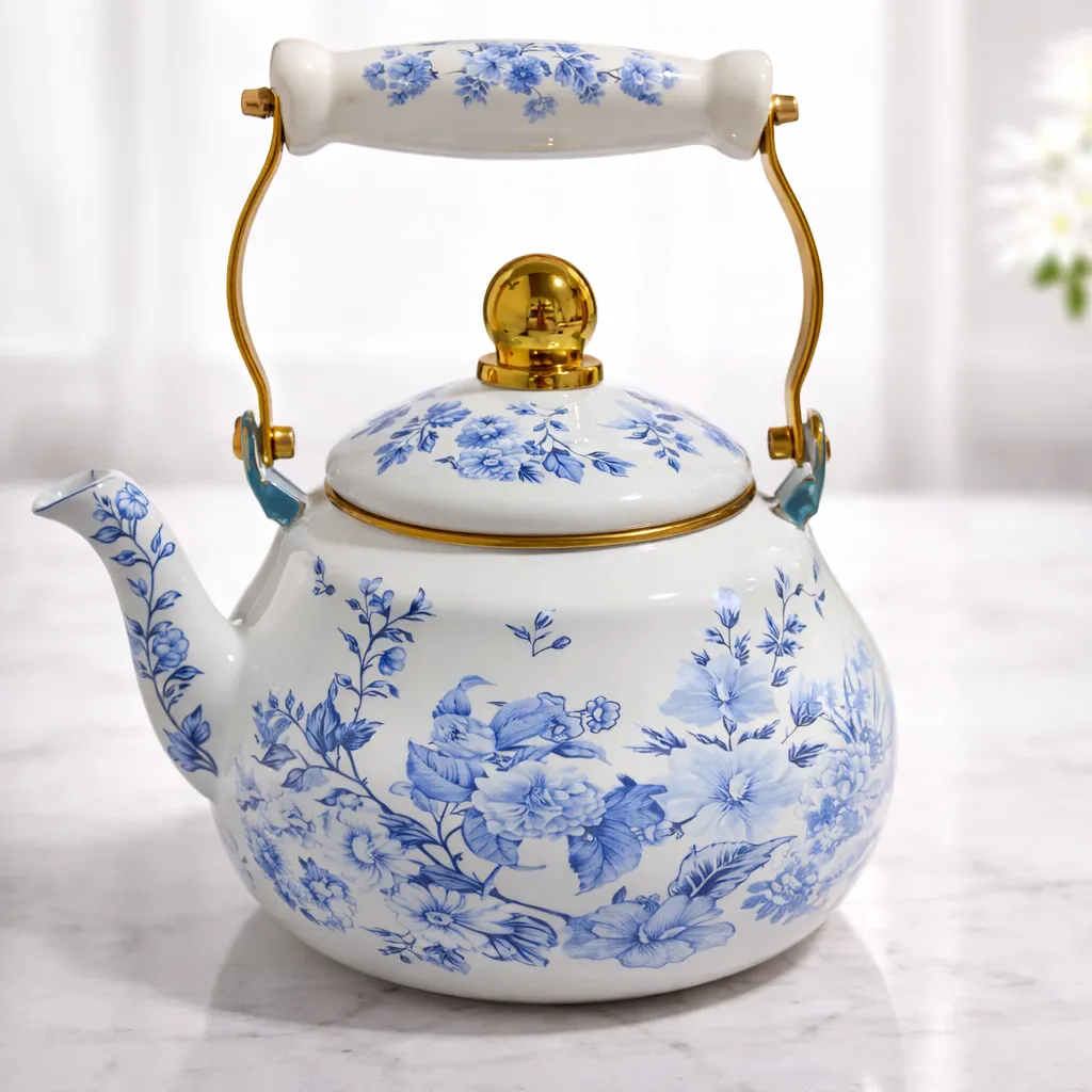 Tetera enlozada de 2 litros con recubrimiento enamel resistente al calor. 23 x 17 cm diseño clásico, duradera y fácil de limpiar. Ideal para uso diario en cocina.