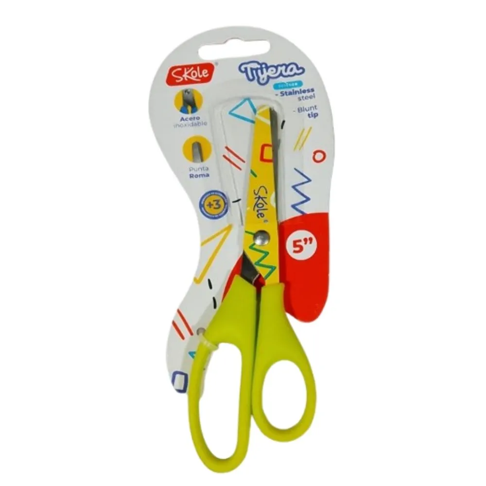 La tijera Skole de 5 pulgadas está fabricada en acero inoxidable de alta calidad, lo que garantiza mayor durabilidad, resistencia a la corrosión y un corte preciso. Su punta roma la hace ideal para uso escolar, oficina y manualidades, brindando mayor seguridad para niños y estudiantes.