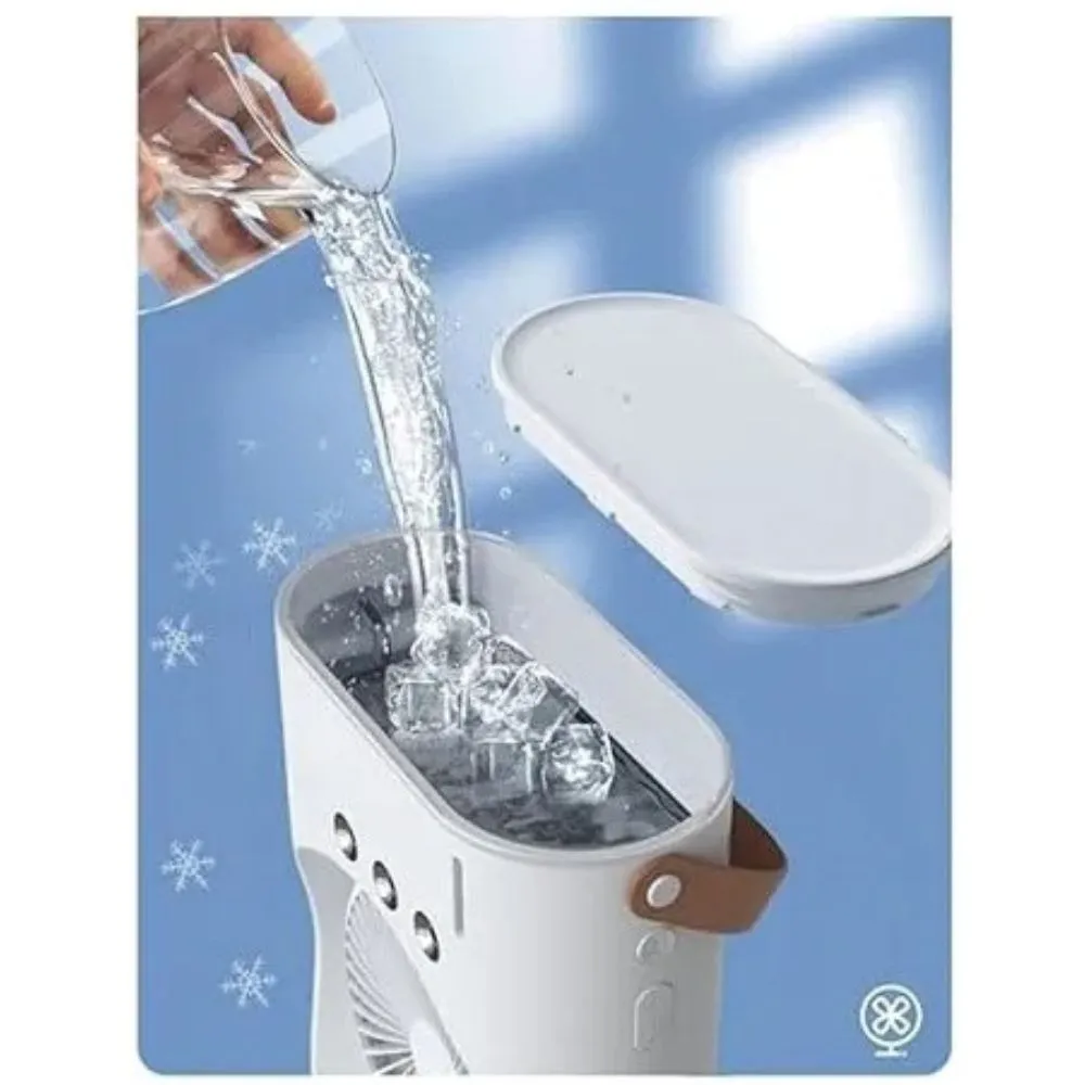 Ventilador portátil de refrigeración por pulverización diseñado para ofrecer una sensación de frescura inmediata. Cuenta con doble cabezal y tres orificios de pulverización, que distribuyen una fina niebla de agua para mejorar el enfriamiento del aire. Su batería recargable de 1800mAh proporciona un uso práctico y sin cables, ideal para el hogar, la oficina, viajes o actividades al aire libre.